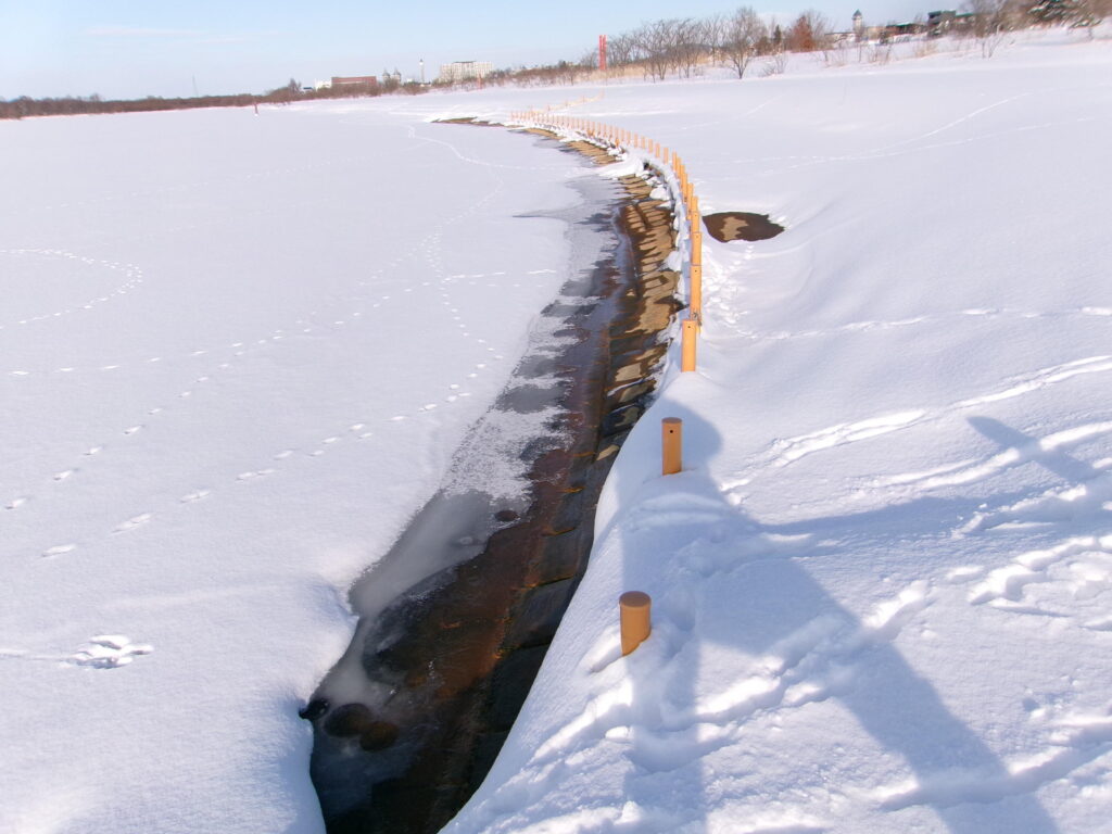 本日,管理棟・河川事務所・砂川市の三者で遊水地の氷の状況を調査しました。