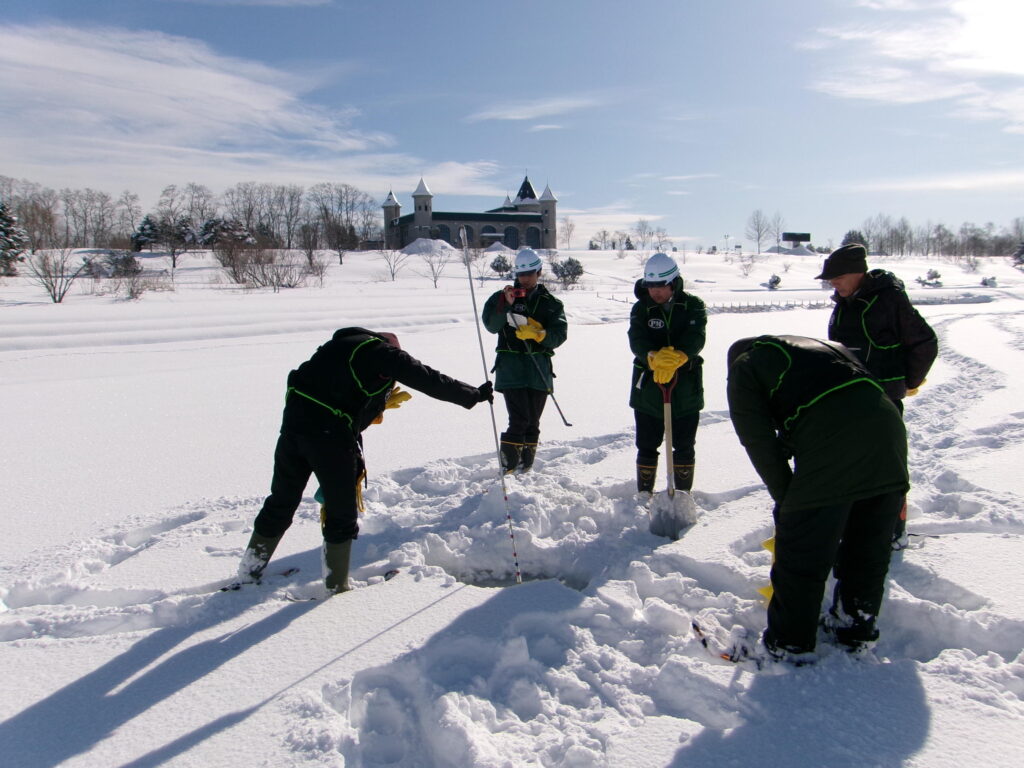 気温の低い日が続かず,日中の気温も高いため,危険すぎて氷の厚さの測定もできません。