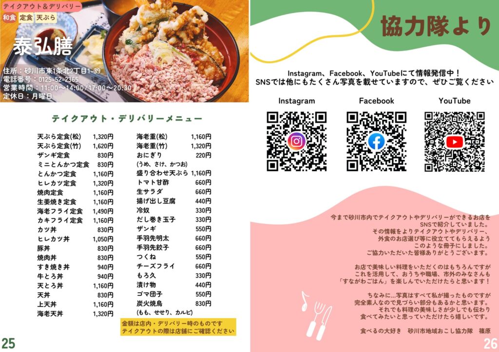 砂川市地域おこし協力隊が作成したテイクアウト・デリバリーの情報です。