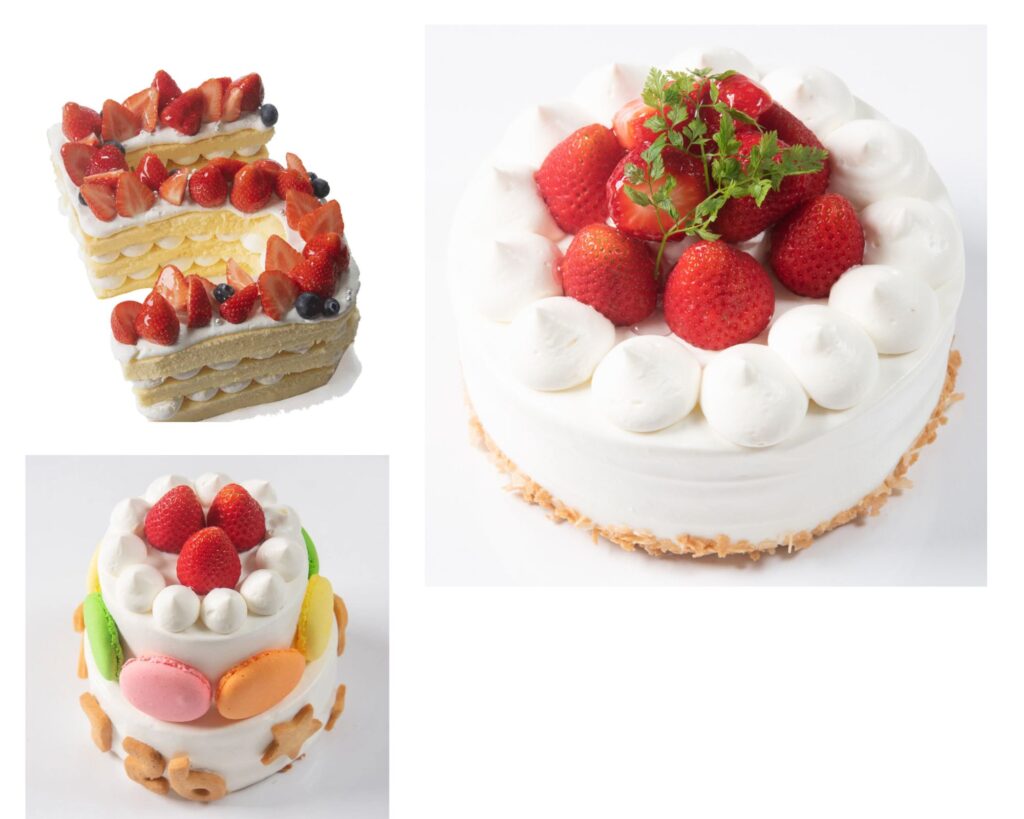 王道の生クリームケーキはもちろんのこと、華やかで目を引くケーキや