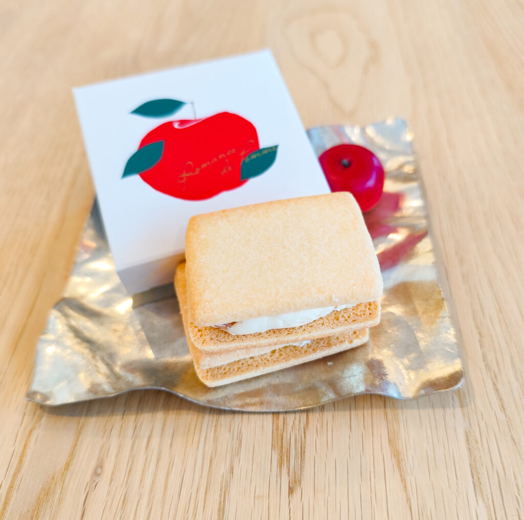 サクサクのサブレにオリジナルホワイトチョコレートとプレザーブ(ジャムより形がある状態)された林檎がサンドされたシンプルだけど心が満たされるお菓子です。