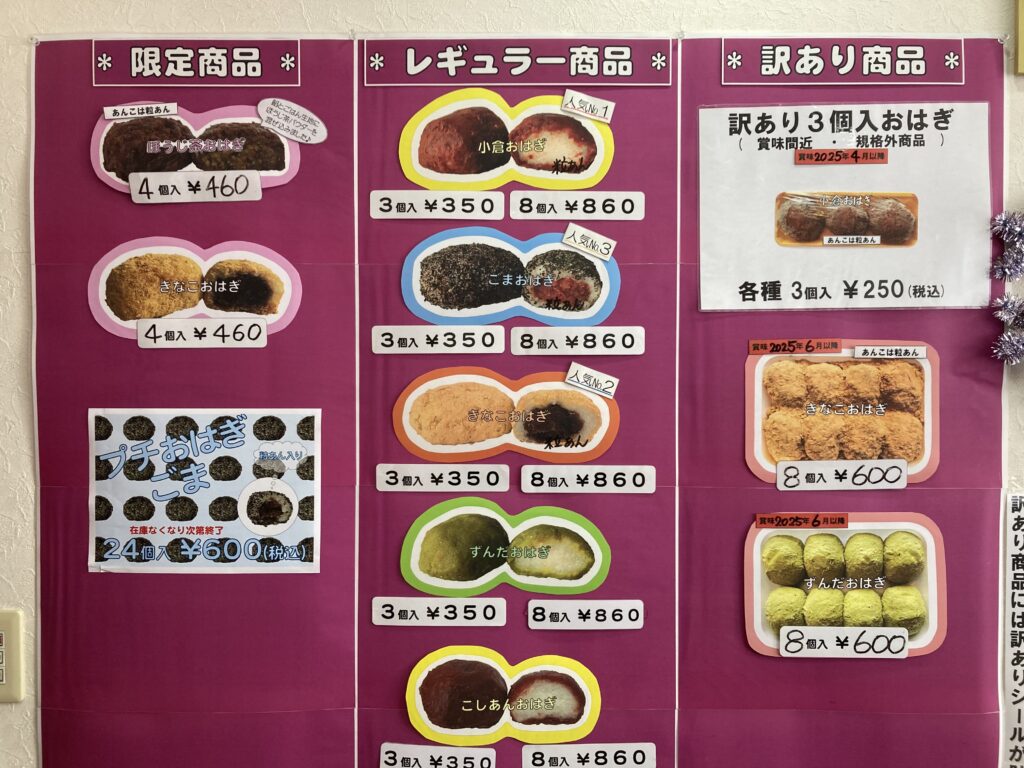 常時取り扱いをしているのが『特製おはぎ』『ごまおはぎ』『きなこおはぎ』『ずんだおはぎ』『こしあんおはぎ』があります。