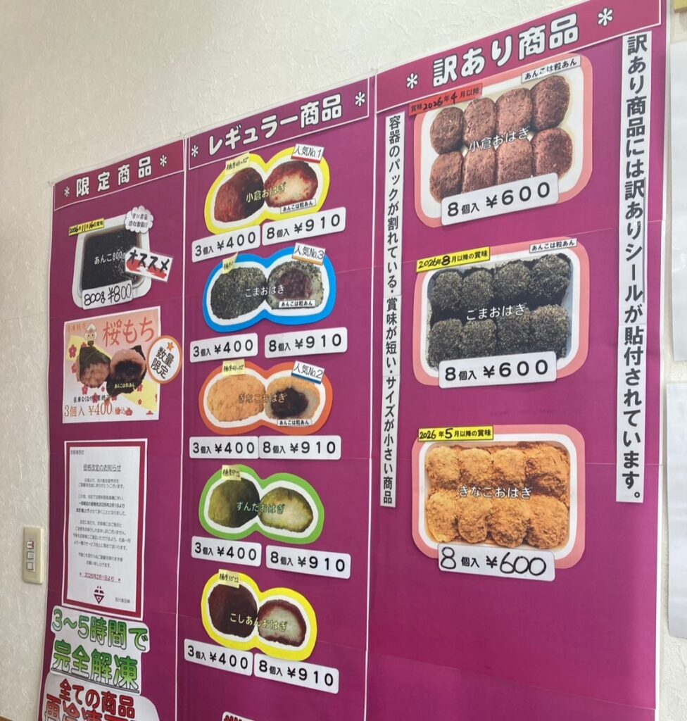 常時取り扱いをしているのが『特製おはぎ』『ごまおはぎ』『きなこおはぎ』『ずんだおはぎ』『こしあんおはぎ』があります。