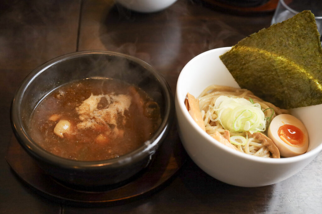 北海道産小麦3種をブレンドして作られたもちっ、ぷりっとした麺の食感が楽しめるつけ麺専用の太麺と濃厚な魚介の旨味が感じられる美味しいつけ麺です。たれをお好みの濃さに薄められる出汁もついてカスタマイズしながらお召し上がりいただける一品です!残ったつけだれにご飯を入れて食べる方もいらっしゃいますよ!!